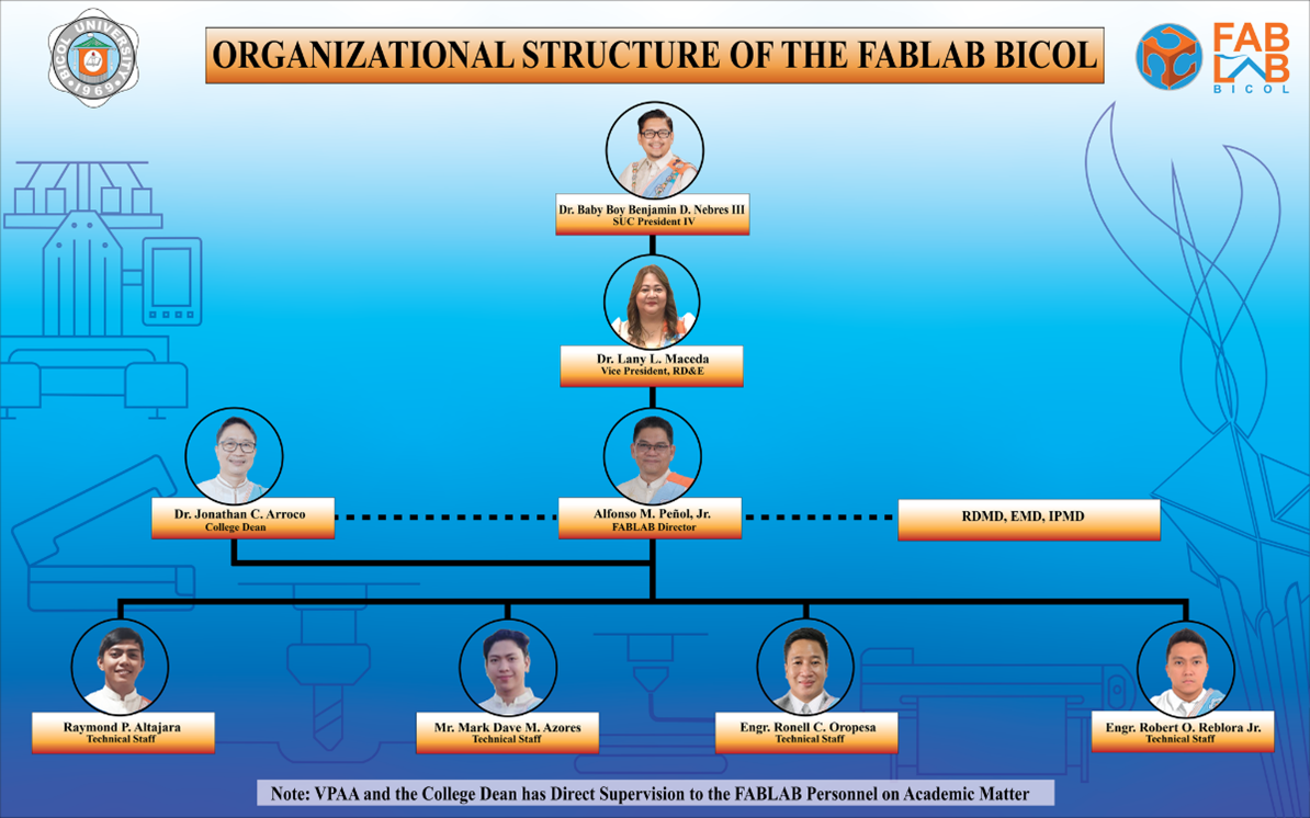 The Fabrication Laboratory Bicol is hosted by the Bicol University s a project between BU and DTI-ROV, aimed at improving the competitiveness of Bicol products through a Shared Service Facility (SSF). Likewise, the Fab lab will also provide support to instruction, research, extension and production functions of the university.