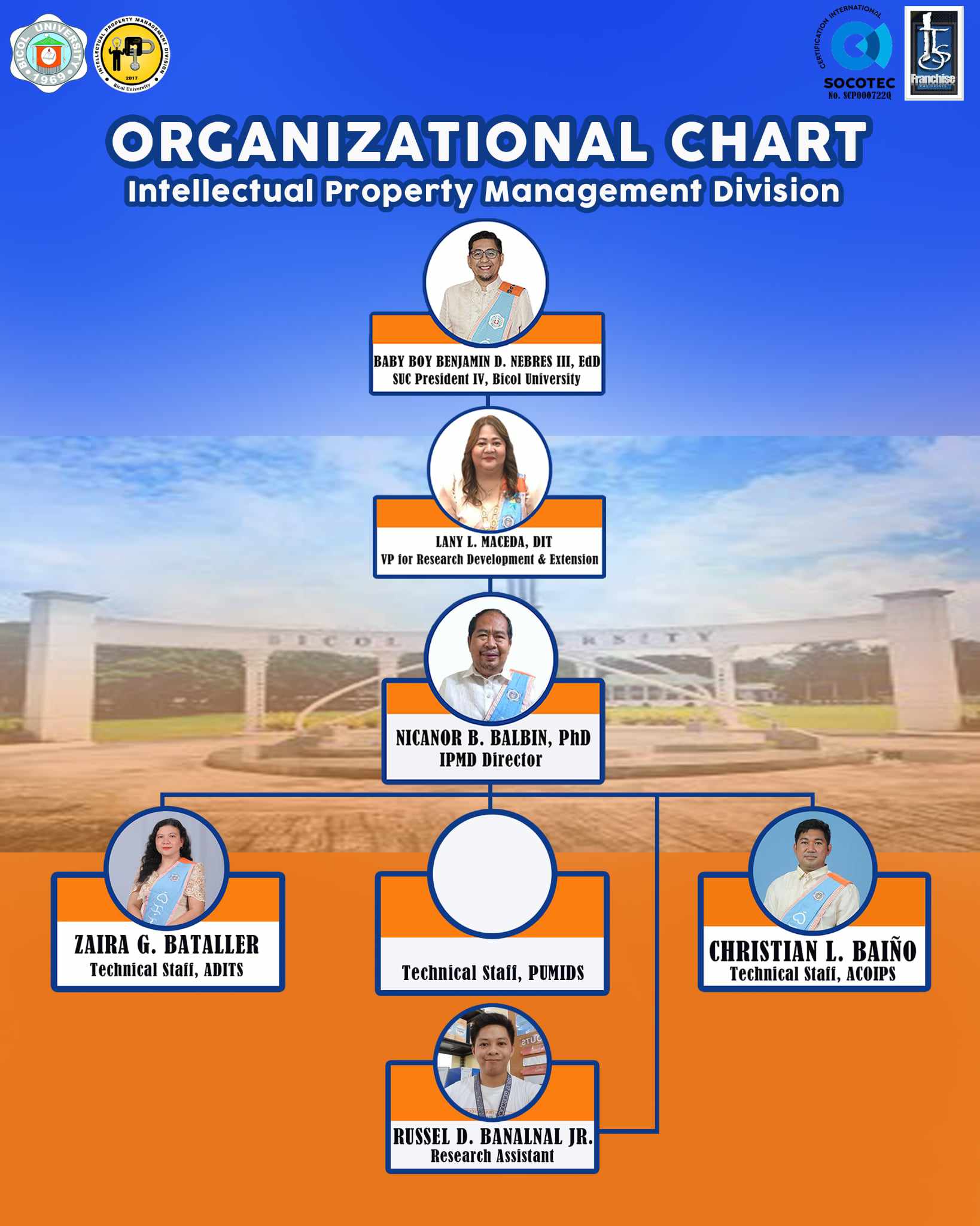 The BU IP office that shall be responsible for the overall management, planning, implementation, monitoring of intellectual property, and evaluation of the IP-related activities of the university shall be under the umbrella Office of the Vice-President for Research, Development and Extension. The BU IP office shall be called Intellectual Property Management Division (IPMD). It shall be headed by a Director. The BU IP office shall have the three sections namely: (1) Audit, Dissemination, Information and Training Section, (2) Assignment, Copyright, and other IP’s Section, and (3) Patent and Utility Model and Industrial Design Section.